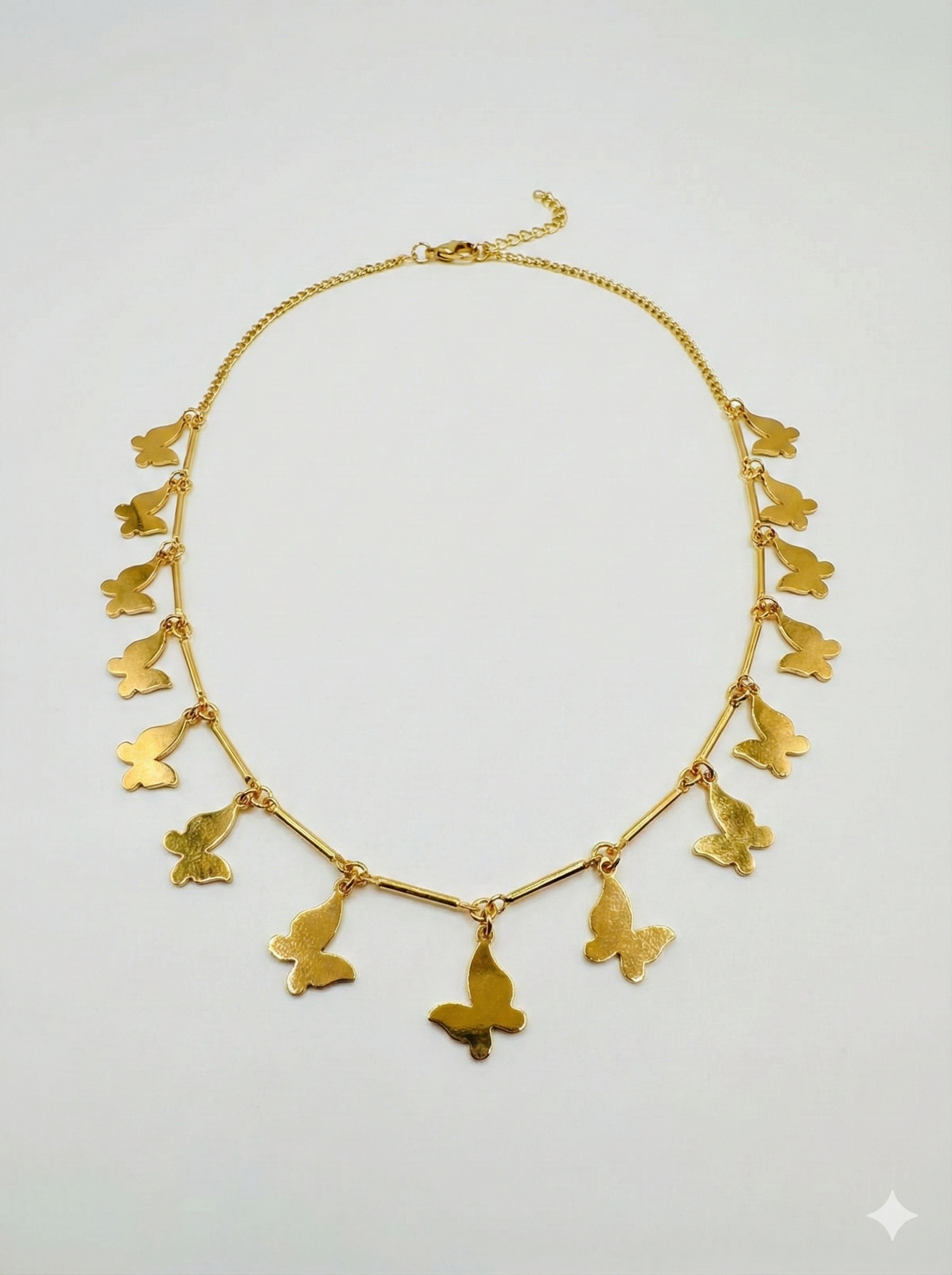 The solid gold-tone butterflies reflect the light beautifully, adding a touch of nature-inspired elegance to any look. Whether you're dressing up for a special occasion or adding a bit of shine to your everyday style, this necklace is a perfect choice.
