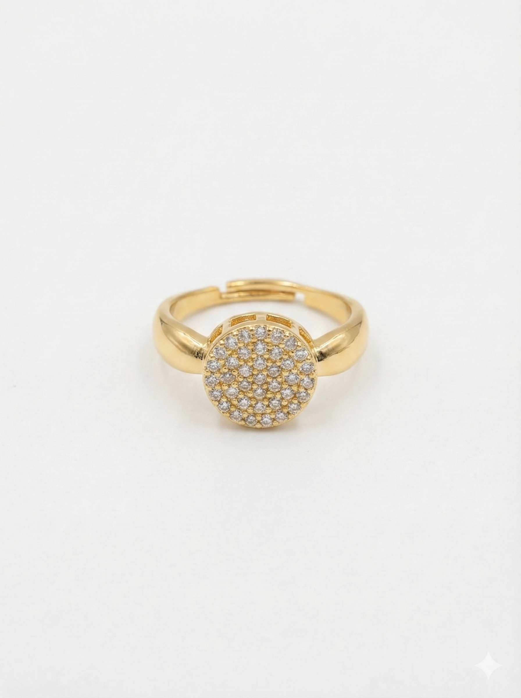 Meet your new everyday essential. This Gold Tone Crystal Disc Ring packs a punch of sparkle in a sleek, modern silhouette. Featuring a micro-pave setting on a bold circular face, this ring delivers high-shine energy.